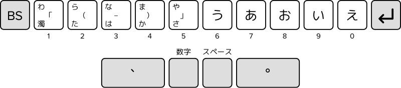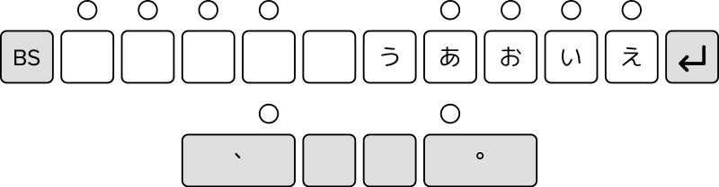たとえば「ペ」を打ちたいときは「濁」キー(左小指)と、母音キーの「え」右小指)の計2キーを同時に押します。